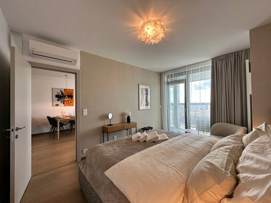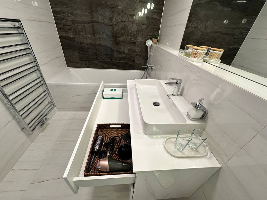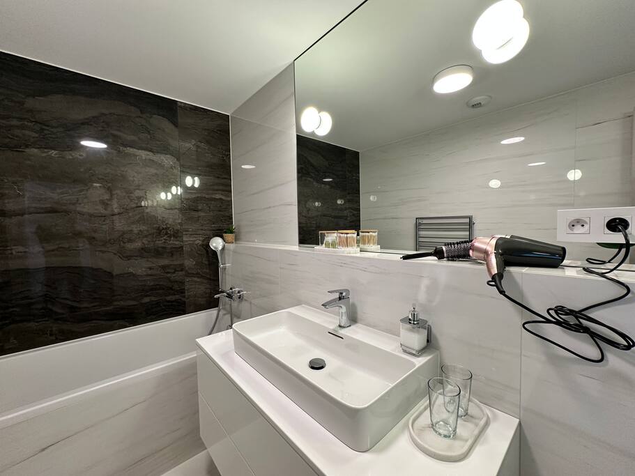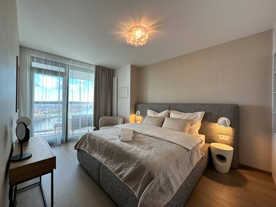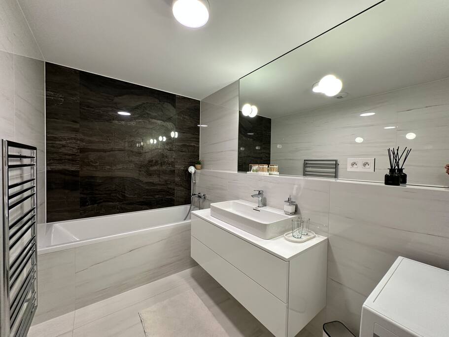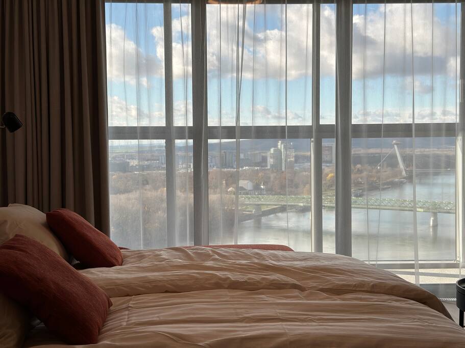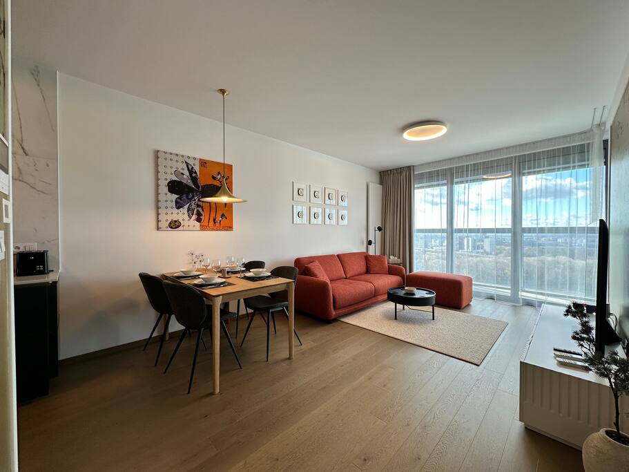 Wake up above Bratislava in a stylish 1-bedroom apartment on the 24th floor of Eurovea Tower with a spacious balcony and a panorama of the city center. - Fully equipped kitchen (presso, toaster, microwave, induction, oven, fridge with freezer, dishwasher). - Free fast Wi-Fi internet. - Large smart TV (Netflix, YouTube, HBO, Prime). - Sofa bed, large double bed. - Bathroom with bathtub, towels, and toiletries. - Washing machine, iron, dryer. - Air conditioning. - Parking included.
