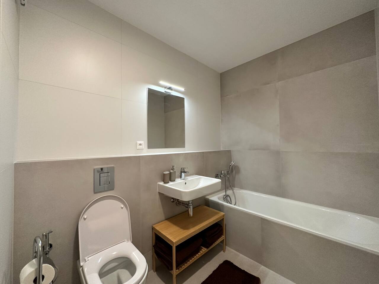 Fully equipped 50m2 apartment with a queen-sized bed in the bedroom and foldable sofa in the living room. The kitchen has standard tools like a dishwasher, microwave oven, fridge, toaster, and espresso machine. In the bathroom, you can find towels, soap, and shampoo.