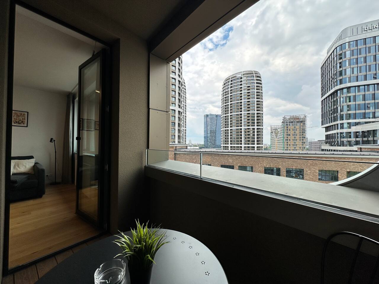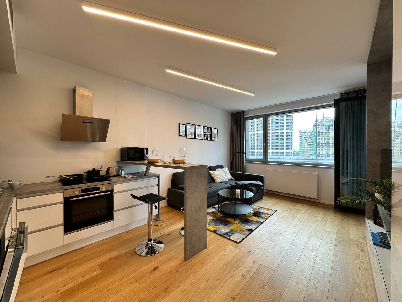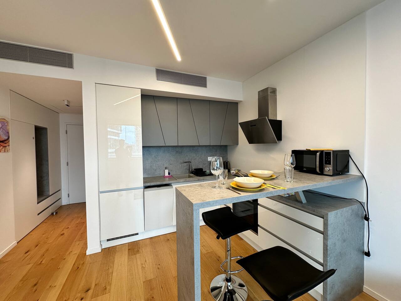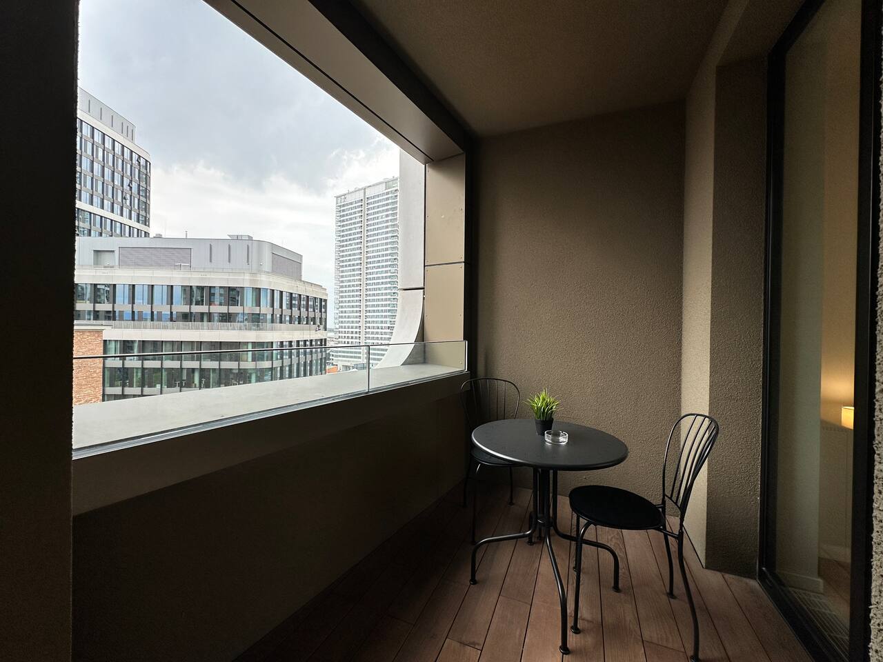 Sky1 Apartment has one bedroom, one living room, one kitchen, one bathroom, and a separate WC. The apartment is on the 7th floor, facing east, and has a large balcony with views of the surrounding buildings. It features air conditioning, a fully equipped kitchen with utensils and cooking tools, a dishwasher, a fridge with a freezer, an induction stove, a microwave, a kettle, and a toaster. The kitchen is separated from the living room by a bar table, comfortably seating two people. The living room has a comfortable sofa and a large smart TV with access to streaming services like YouTube, Netflix, and cable TV channels from Orange. From the living room, you can access a spacious balcony with seating and an ashtray for smokers. The balcony can also be accessed from the bedroom, which has a large double bed (180x200 cm) and a spacious wardrobe. The bedroom has an entrance to the bathroom with a wide shower. The separate WC is accessible from the hallway near the main entrance of the apartment. Guests staying in this apartment can take the elevator to the 30th floor to enjoy the rooftop view of the historic city center or savor a glass of prosecco during sunrise or sunset.