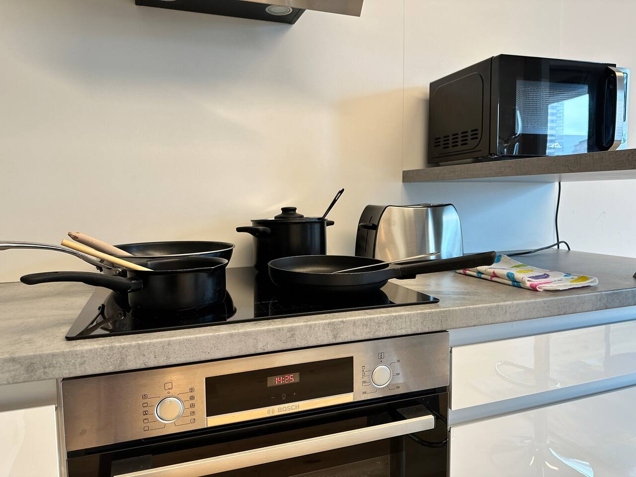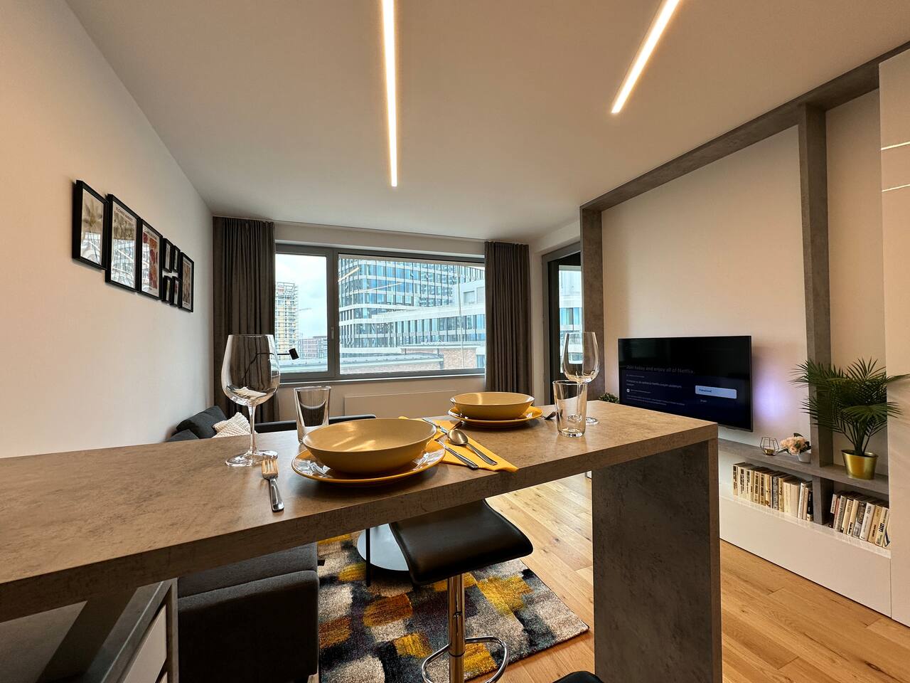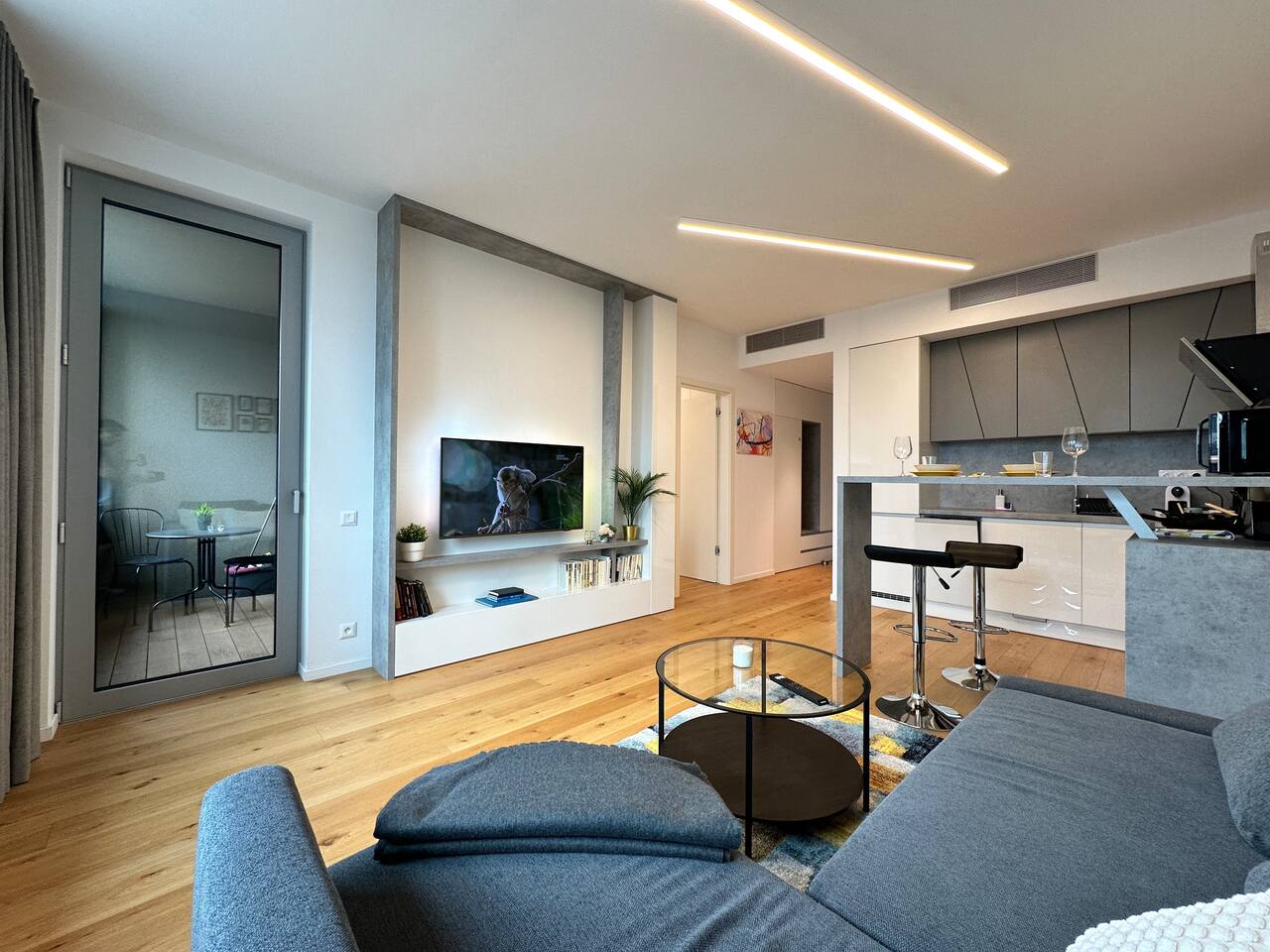 Sky1 Apartment has one bedroom, one living room, one kitchen, one bathroom, and a separate WC. The apartment is on the 7th floor, facing east, and has a large balcony with views of the surrounding buildings. It features air conditioning, a fully equipped kitchen with utensils and cooking tools, a dishwasher, a fridge with a freezer, an induction stove, a microwave, a kettle, and a toaster. The kitchen is separated from the living room by a bar table, comfortably seating two people. The living room has a comfortable sofa and a large smart TV with access to streaming services like YouTube, Netflix, and cable TV channels from Orange. From the living room, you can access a spacious balcony with seating and an ashtray for smokers. The balcony can also be accessed from the bedroom, which has a large double bed (180x200 cm) and a spacious wardrobe. The bedroom has an entrance to the bathroom with a wide shower. The separate WC is accessible from the hallway near the main entrance of the apartment. Guests staying in this apartment can take the elevator to the 30th floor to enjoy the rooftop view of the historic city center or savor a glass of prosecco during sunrise or sunset.
