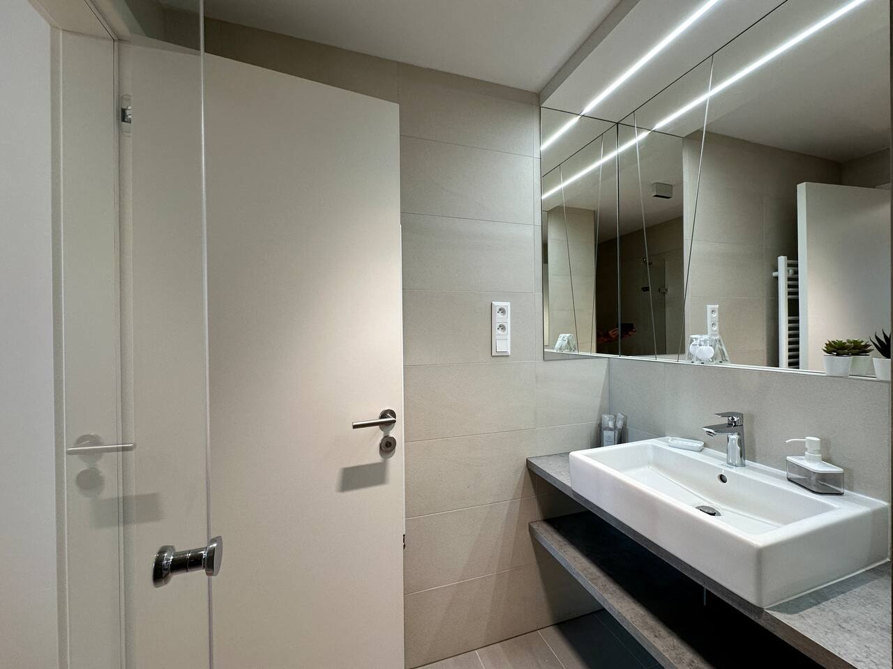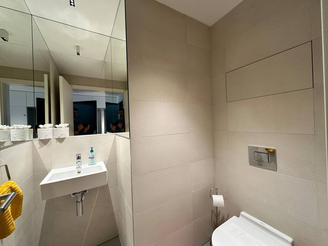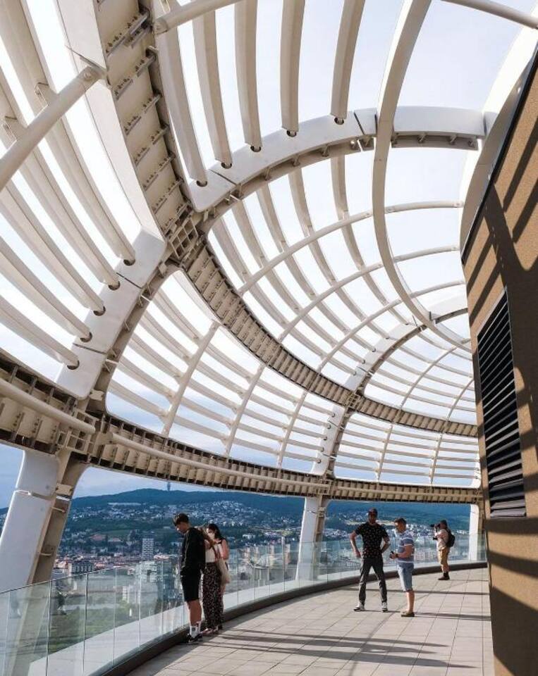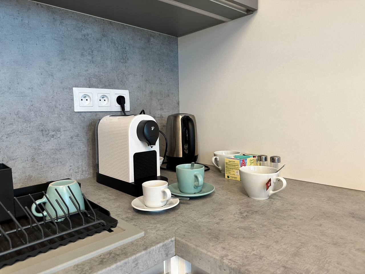 Sky1 Apartment has one bedroom, one living room, one kitchen, one bathroom, and a separate WC. The apartment is on the 7th floor, facing east, and has a large balcony with views of the surrounding buildings. It features air conditioning, a fully equipped kitchen with utensils and cooking tools, a dishwasher, a fridge with a freezer, an induction stove, a microwave, a kettle, and a toaster. The kitchen is separated from the living room by a bar table, comfortably seating two people. The living room has a comfortable sofa and a large smart TV with access to streaming services like YouTube, Netflix, and cable TV channels from Orange. From the living room, you can access a spacious balcony with seating and an ashtray for smokers. The balcony can also be accessed from the bedroom, which has a large double bed (180x200 cm) and a spacious wardrobe. The bedroom has an entrance to the bathroom with a wide shower. The separate WC is accessible from the hallway near the main entrance of the apartment. Guests staying in this apartment can take the elevator to the 30th floor to enjoy the rooftop view of the historic city center or savor a glass of prosecco during sunrise or sunset.