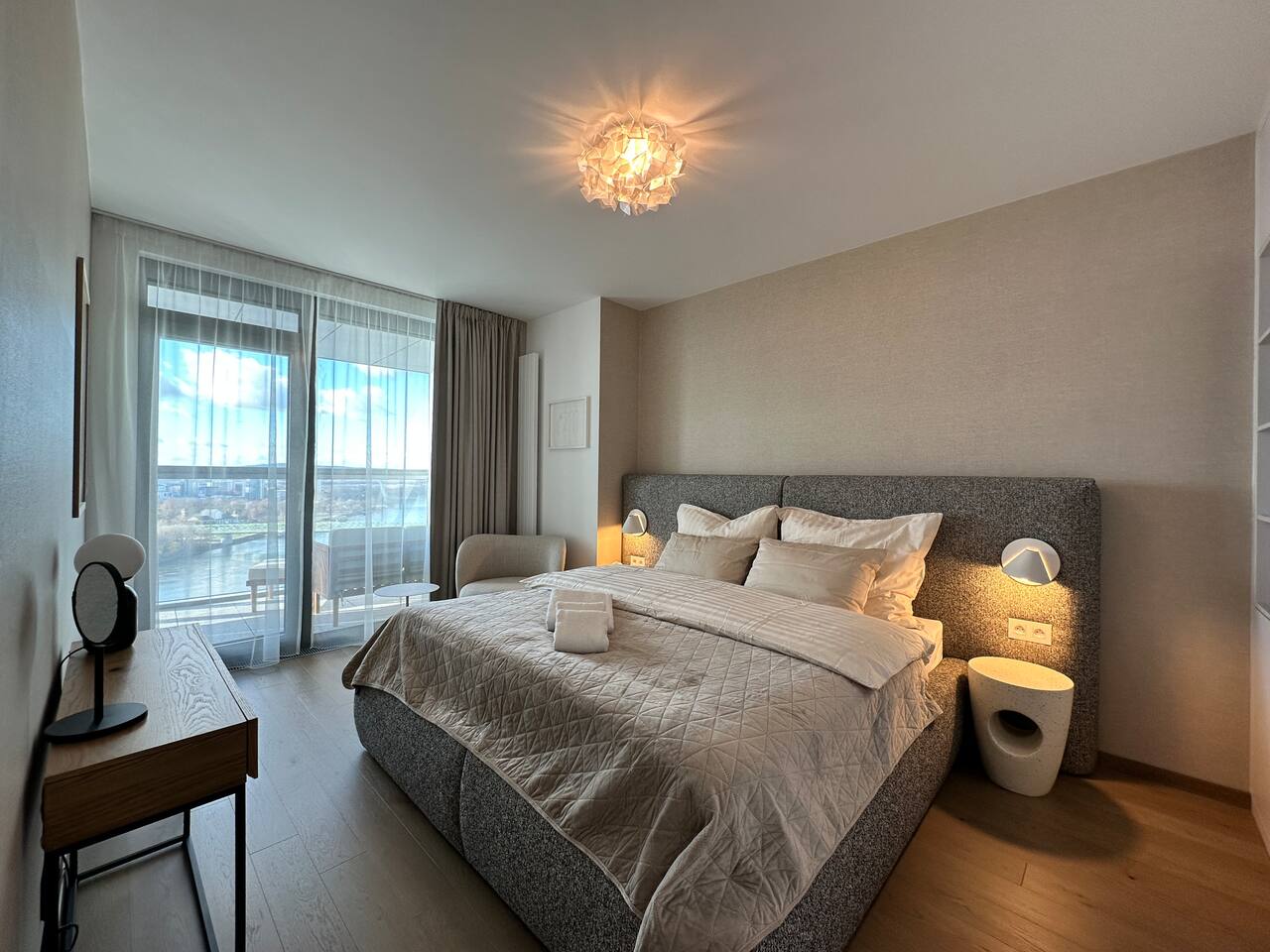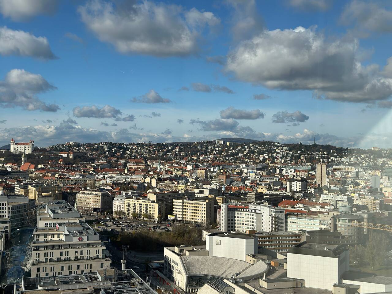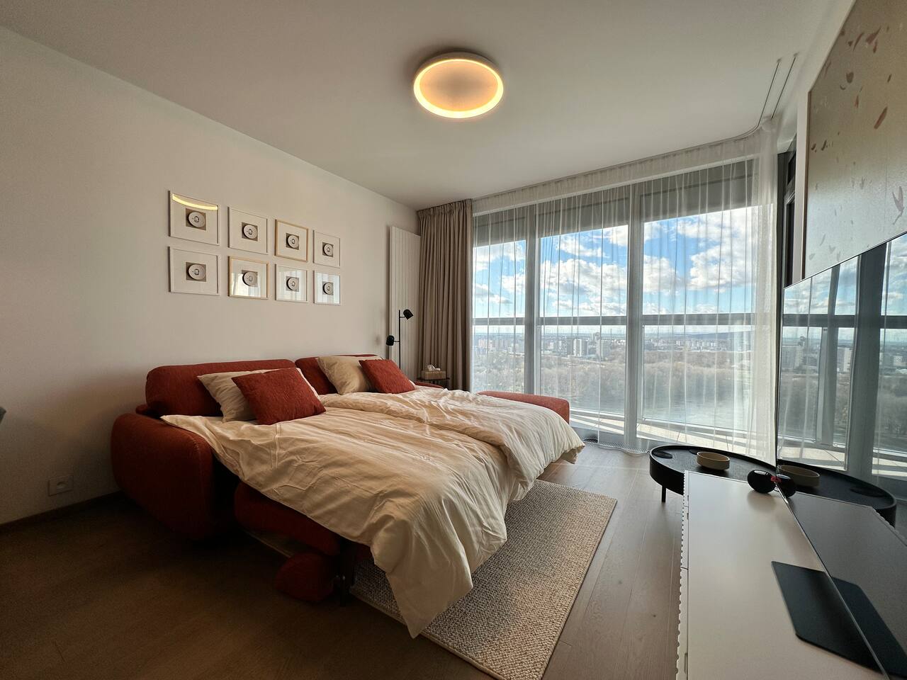 Wake up above Bratislava in a stylish 1-bedroom apartment on the 24th floor of Eurovea Tower with a spacious balcony and a panorama of the city center. - Fully equipped kitchen (presso, toaster, microwave, induction, oven, fridge with freezer, dishwasher). - Free fast Wi-Fi internet. - Large smart TV (Netflix, YouTube, HBO, Prime). - Sofa bed, large double bed. - Bathroom with bathtub, towels, and toiletries. - Washing machine, iron, dryer. - Air conditioning. - Parking included.