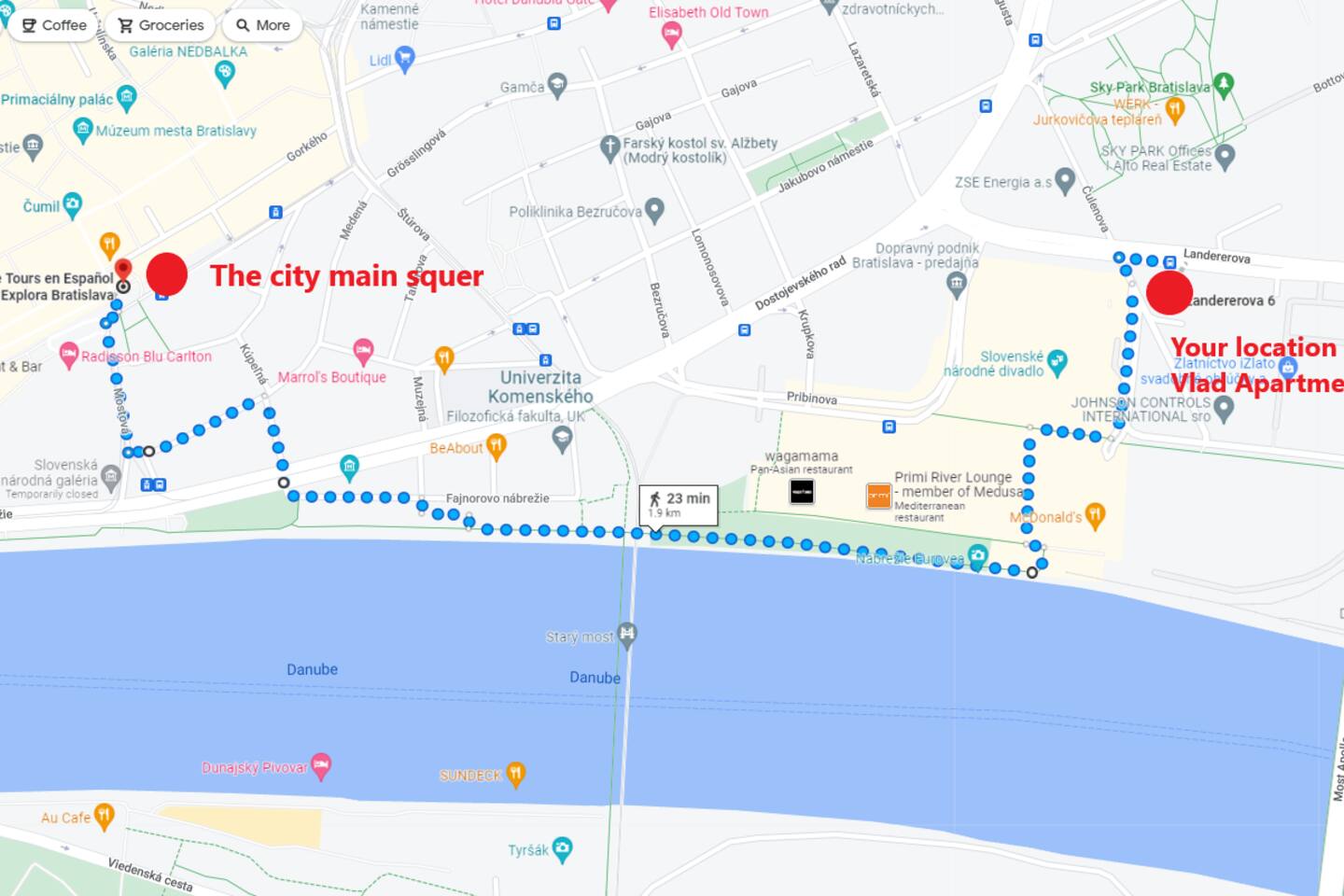 Beautiful Danube riverbank with many people, coffee bars, restaurants, shops, and fitness. You can take a morning run on the bank. Or meet your friends for a beer in the evening. Historical city center, cultural center, sports, and shopping venues are all within reach by foot in a few minutes. Excellent access by car/taxi/bus.